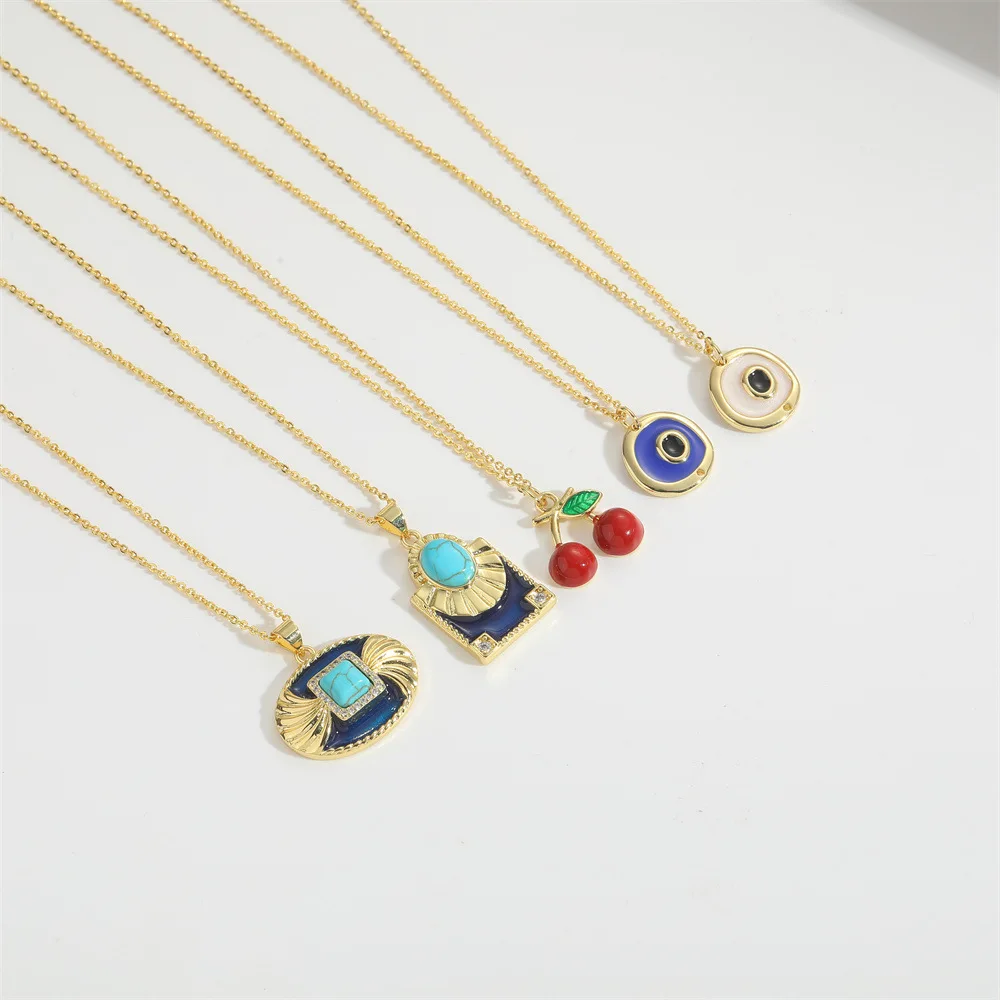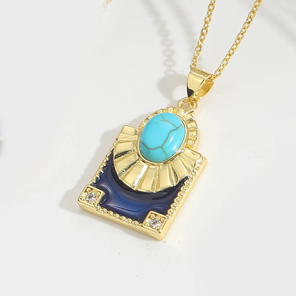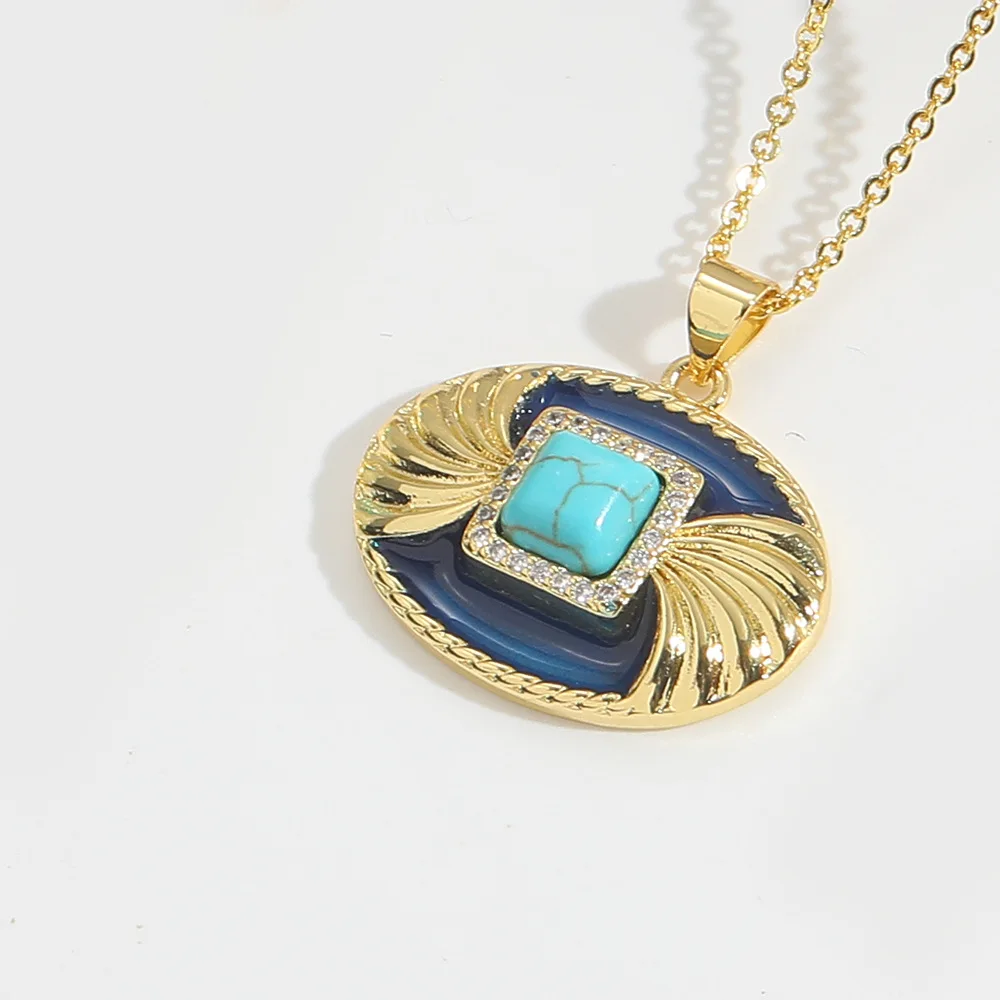Vintage Gold Plated Turquoise Pendant Necklace Adjustable Enamel Drop Choker Beaded Bracelet Copper Main Material Women's Gift