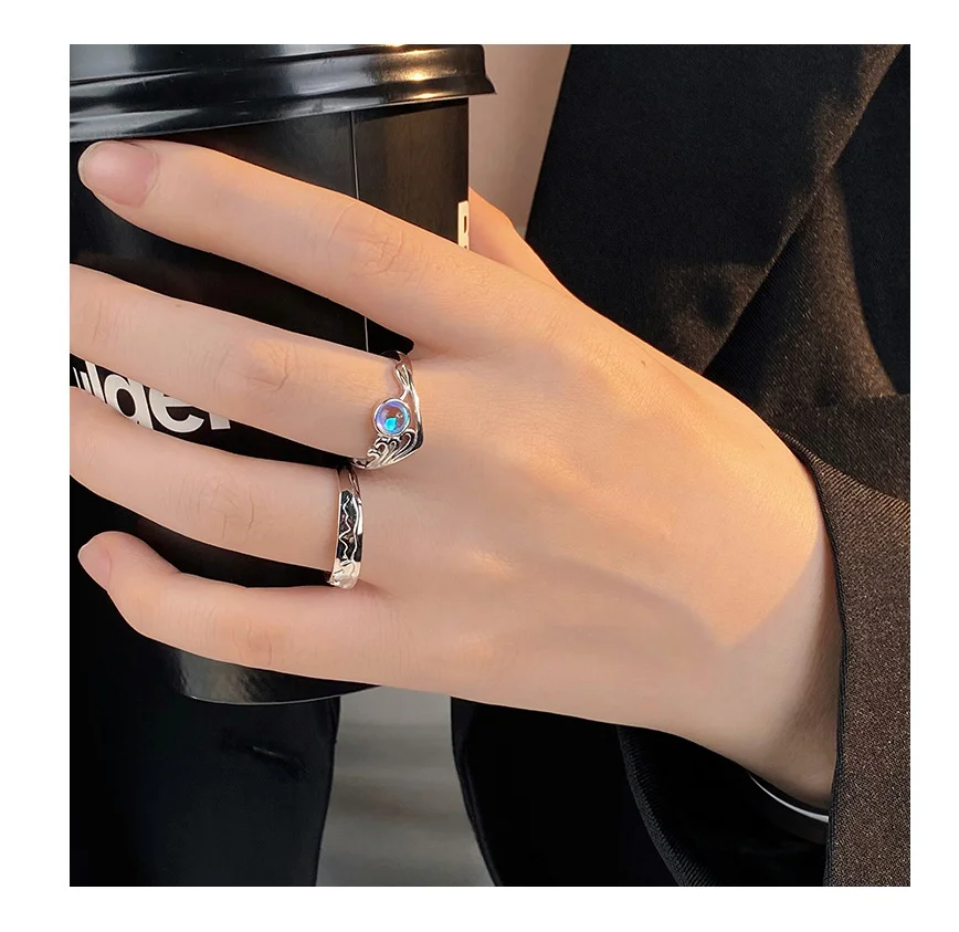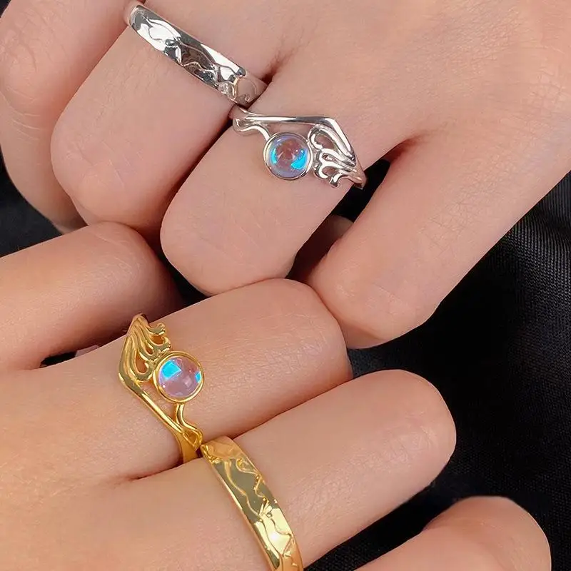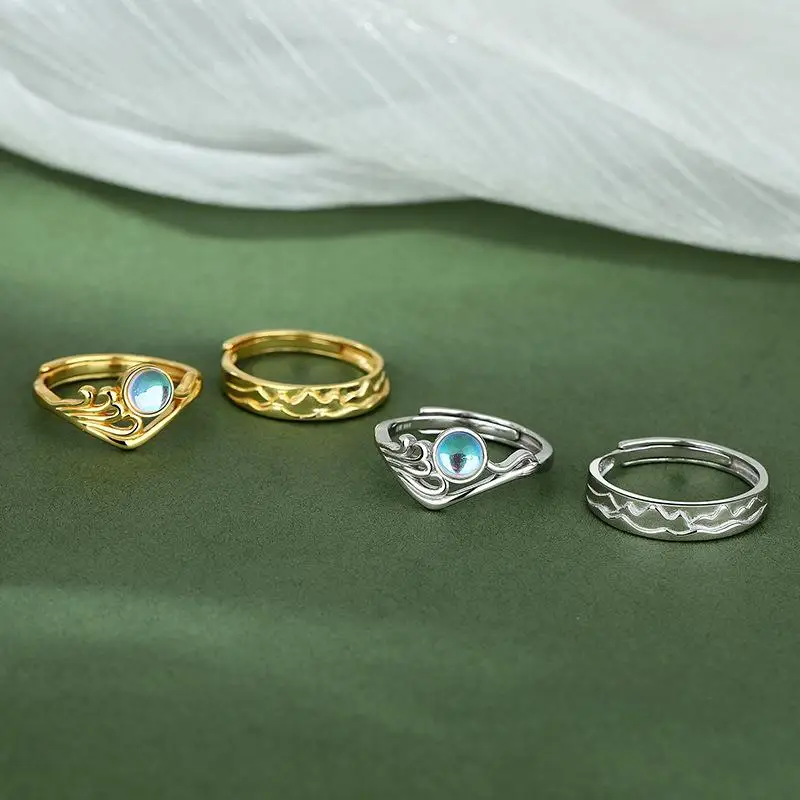 Custom Engraved Ocean Mountain Couple Rings Set Adjustable Mountain & Ocean Wave Moonstone Ring for Valentine's Gift