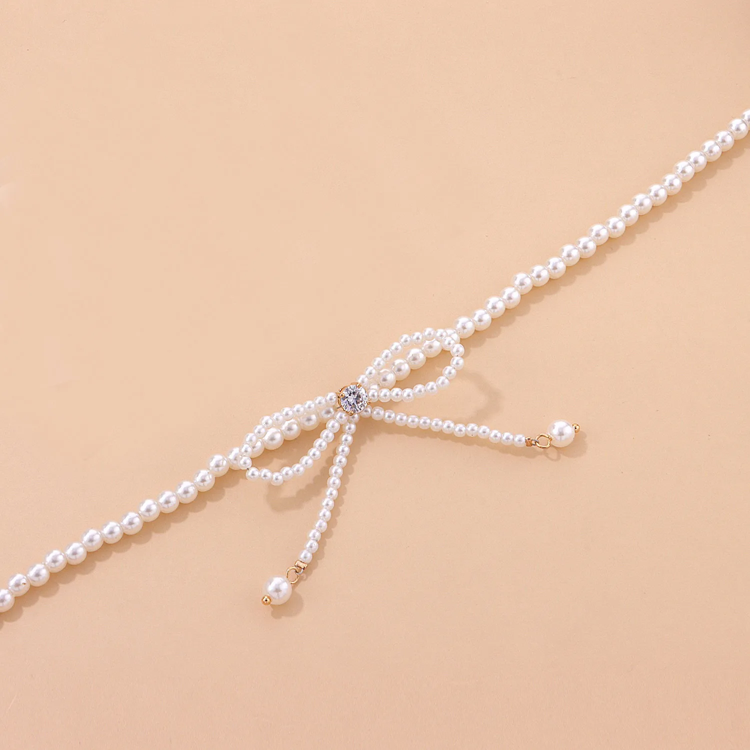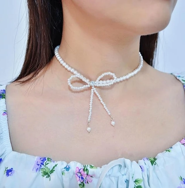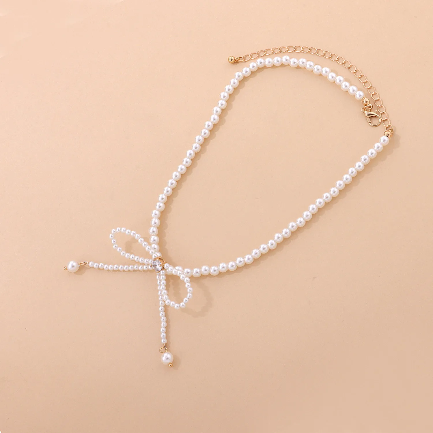 Elegant and Sweet Artificial Pearls Necklace with Tassels Bowknot Clavicle Temperament Chain Adjustable for Women