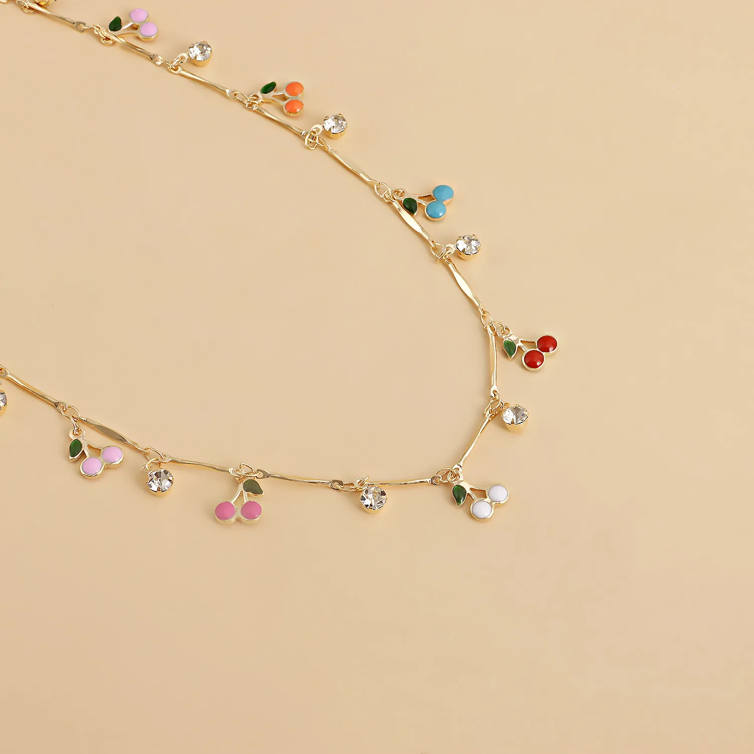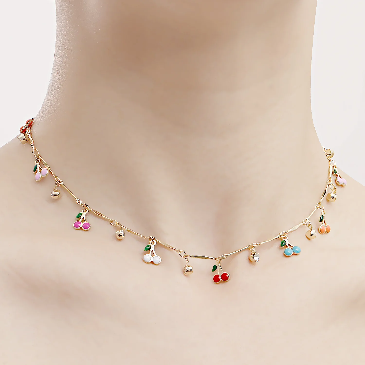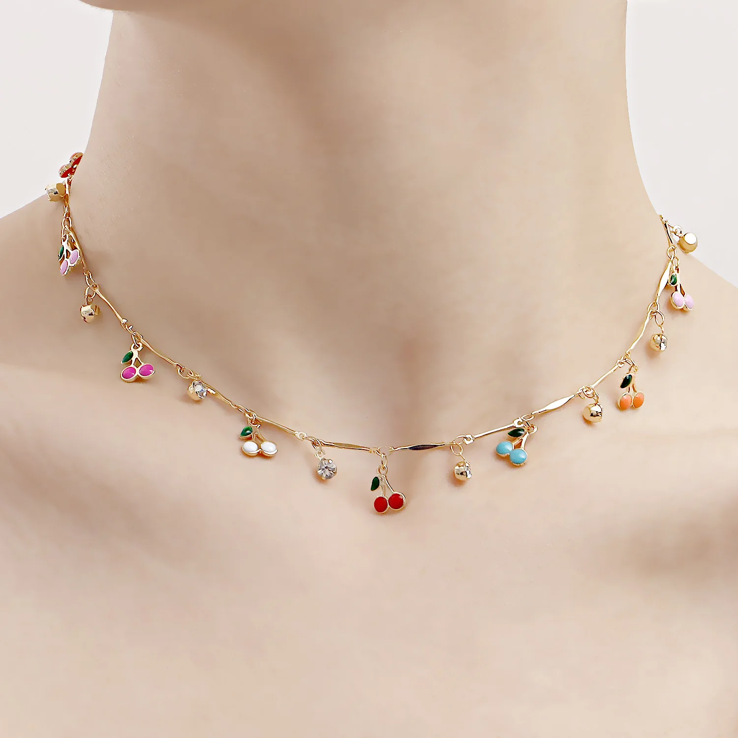 Women's Dainty Gold Chain Necklace with Colorful Cherry Charm Pendant Fruit Beaded Choker-Fashionable Choker Necklace