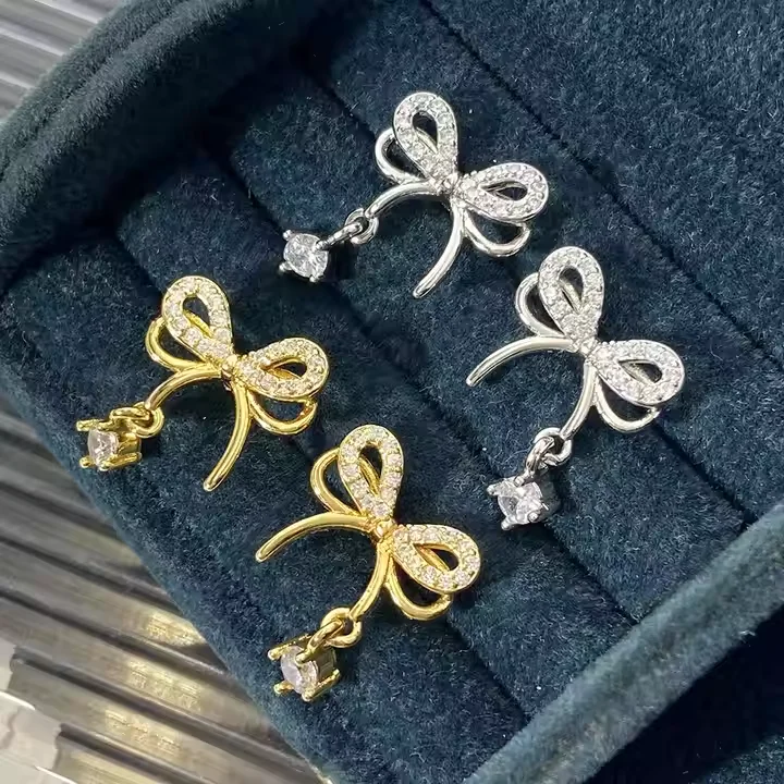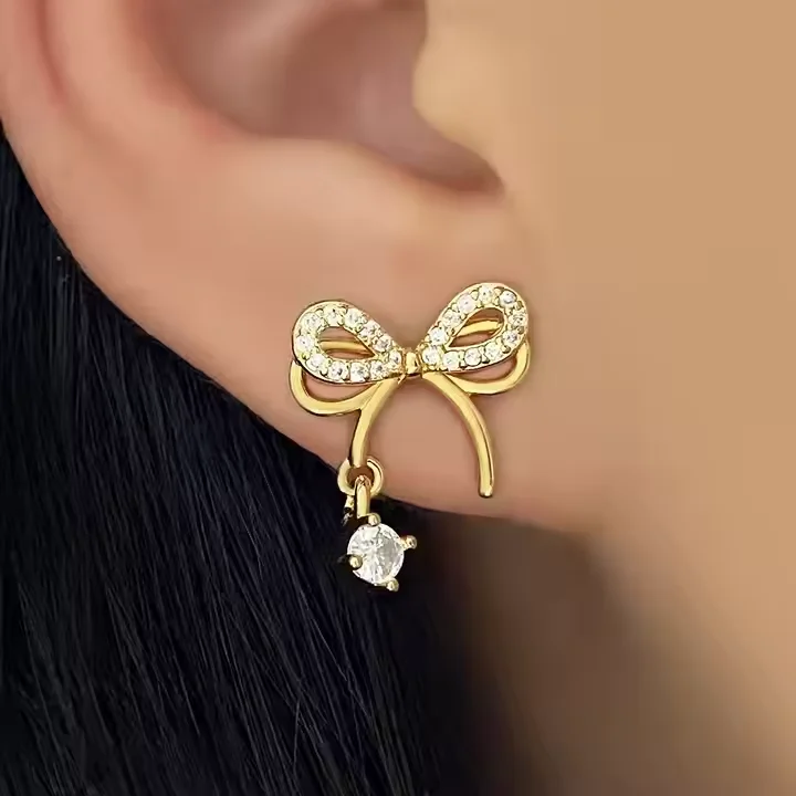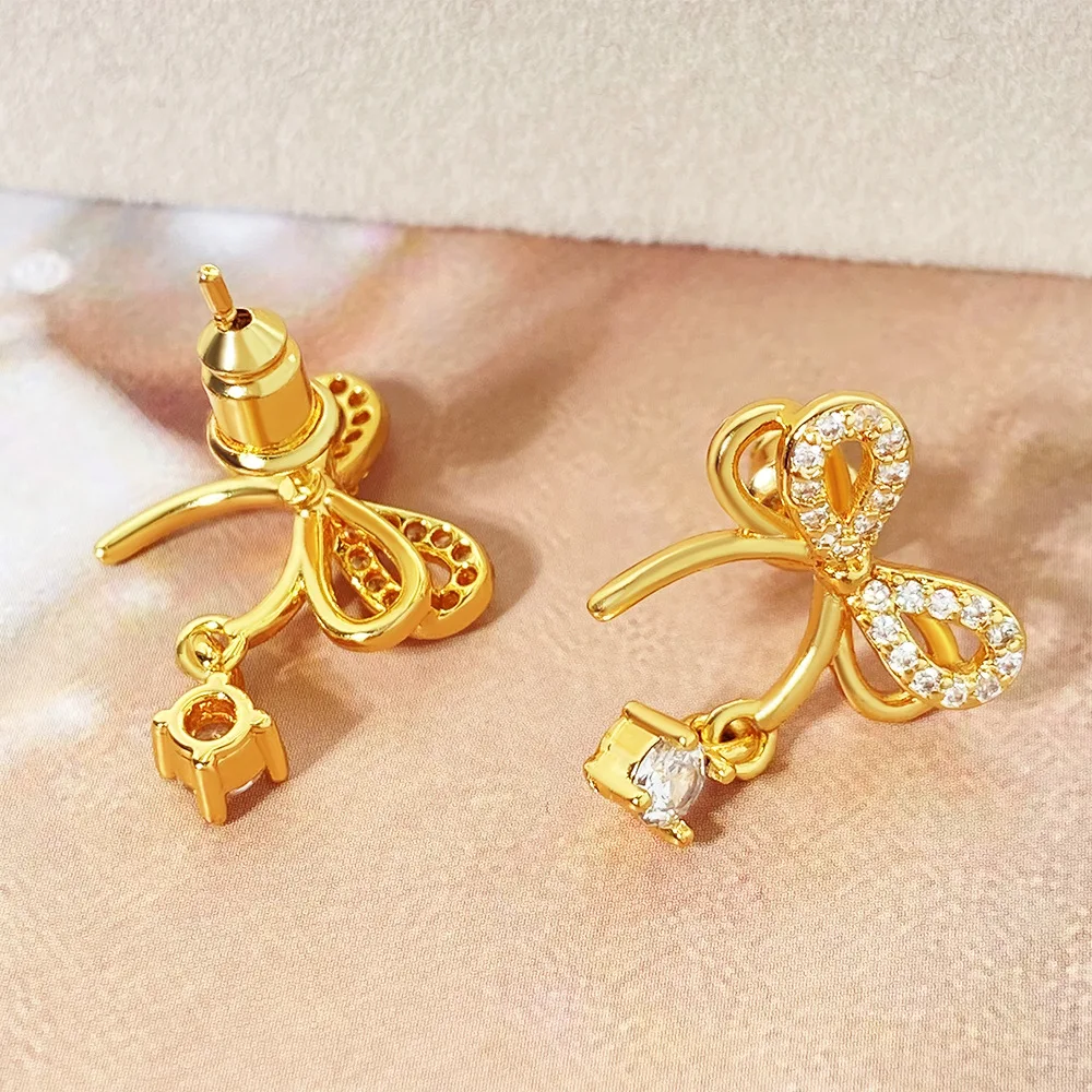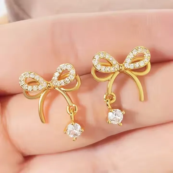 Lightweight Elegant White Zircon Studs 18K Gold Bow Design Delicate and Small Women's New Favorite