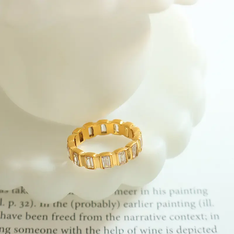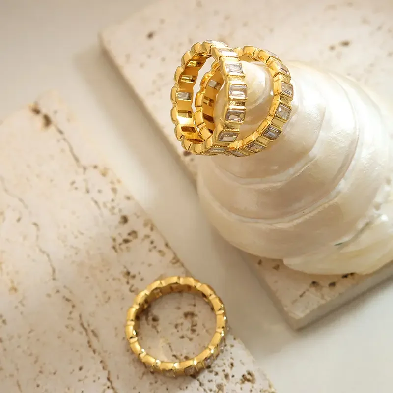 Luxury Stainless Steel Shiny Zircon Pave Ring for Women Hypoallergenic Waterproof 18K Gold Plated Heritage Ring Jewelry
