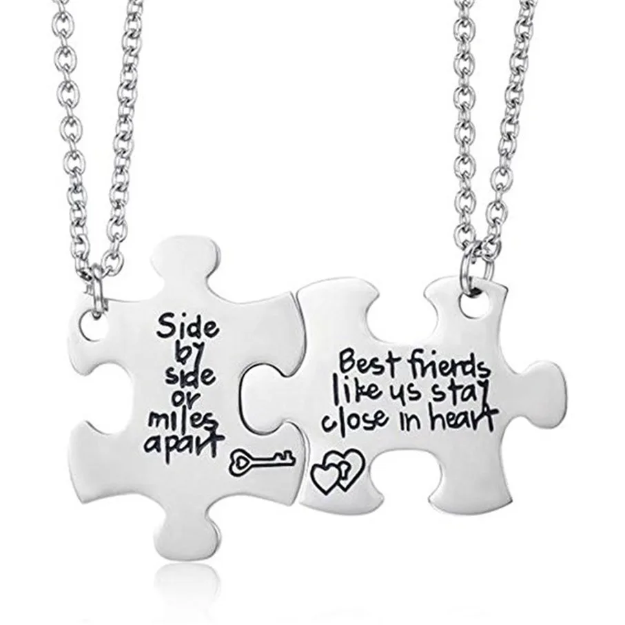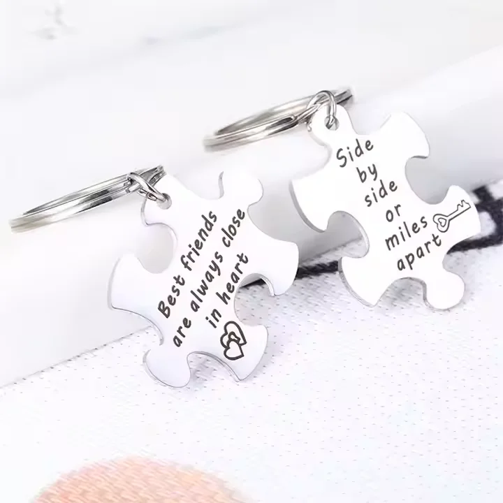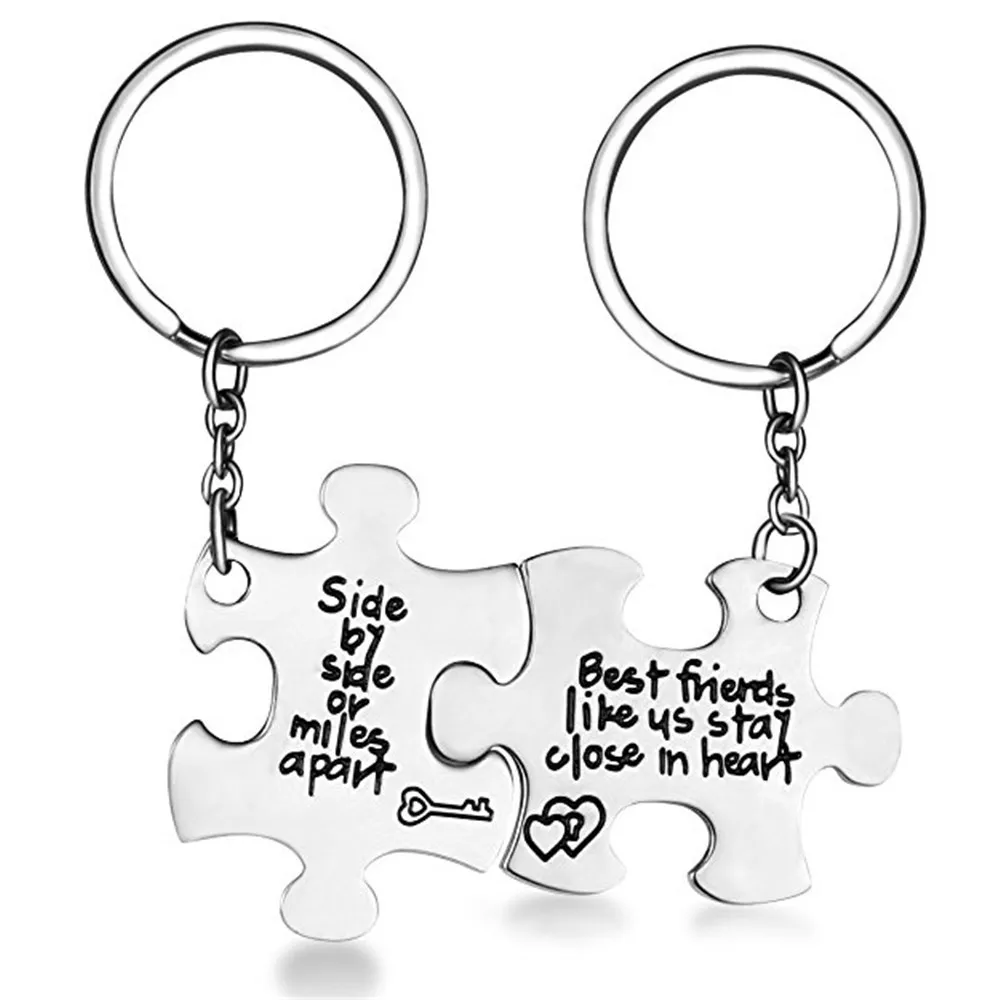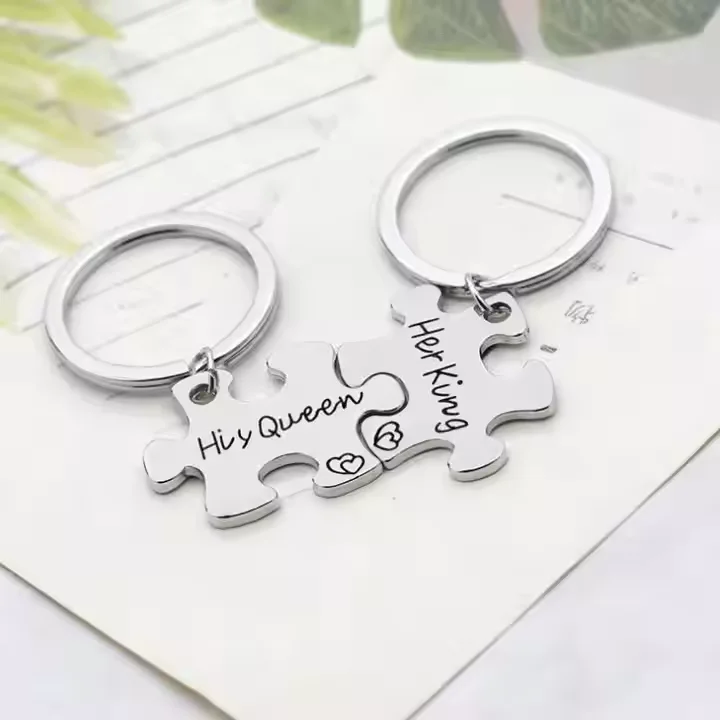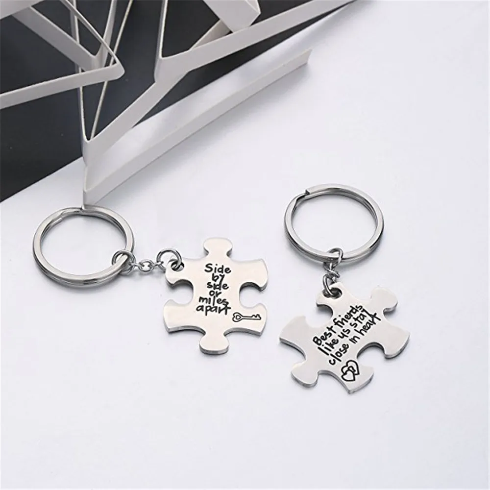Valentine's Day Puzzle Piece Pendant Necklace KeyChain Set for Men Women Stainless Steel Couple Necklace
