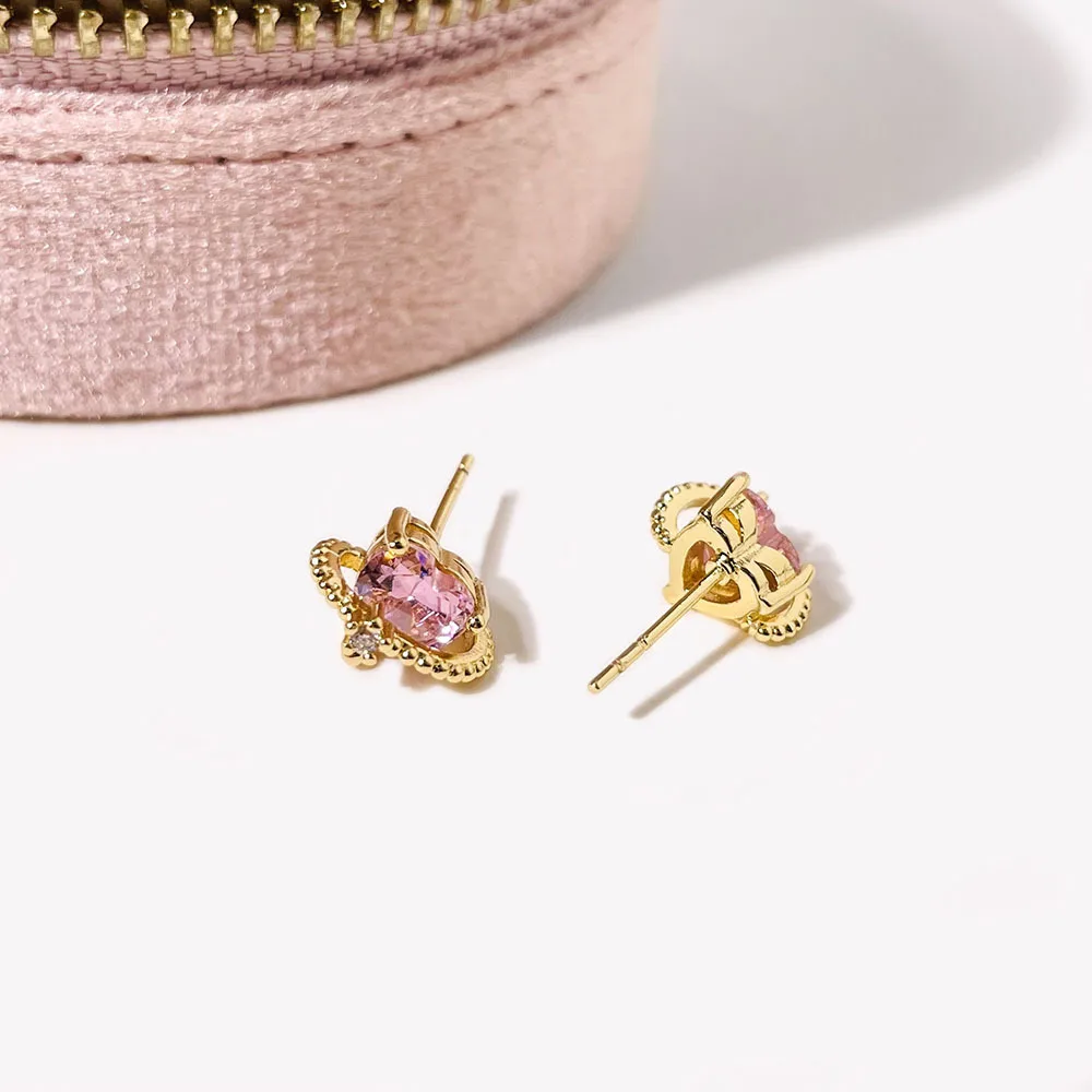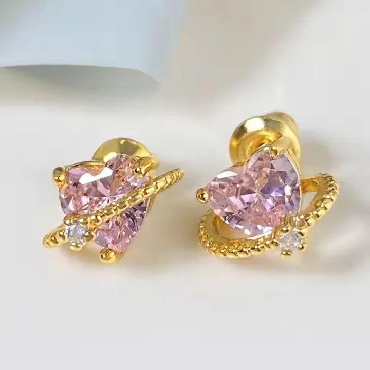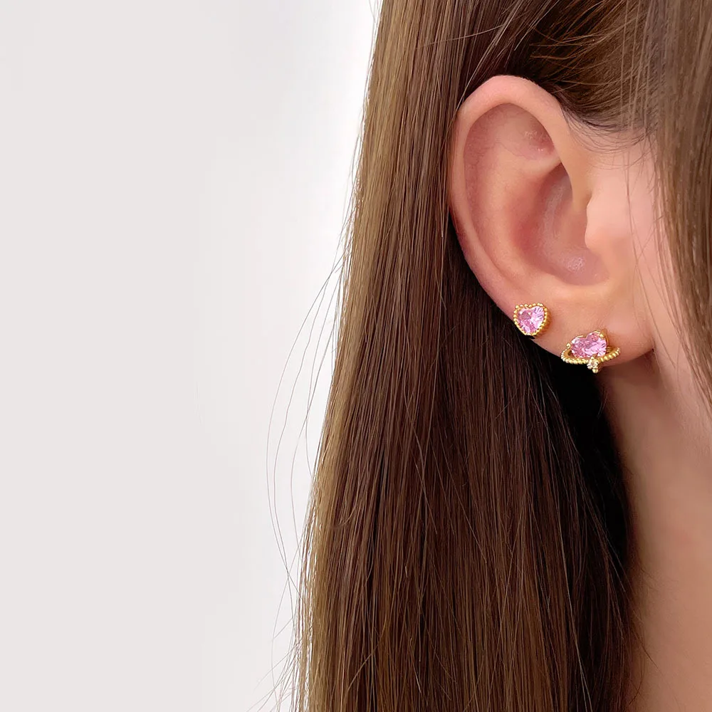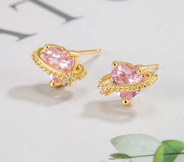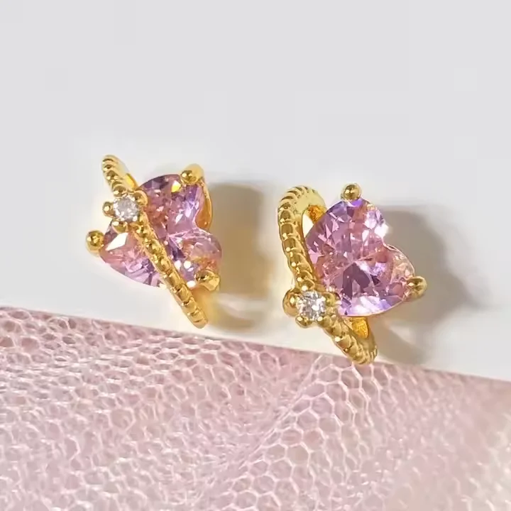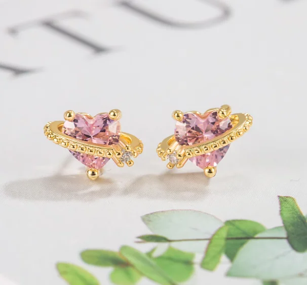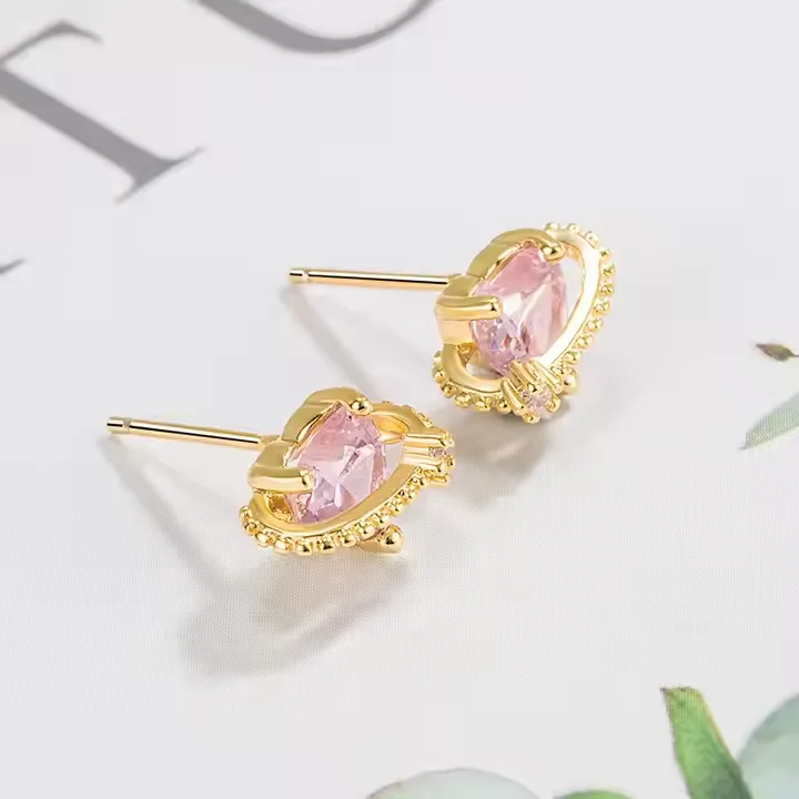 Fashionable Heart Shaped Stud Earrings Inlaid With Pink Cz Gold Plated Suitable for Women's Daily Wear