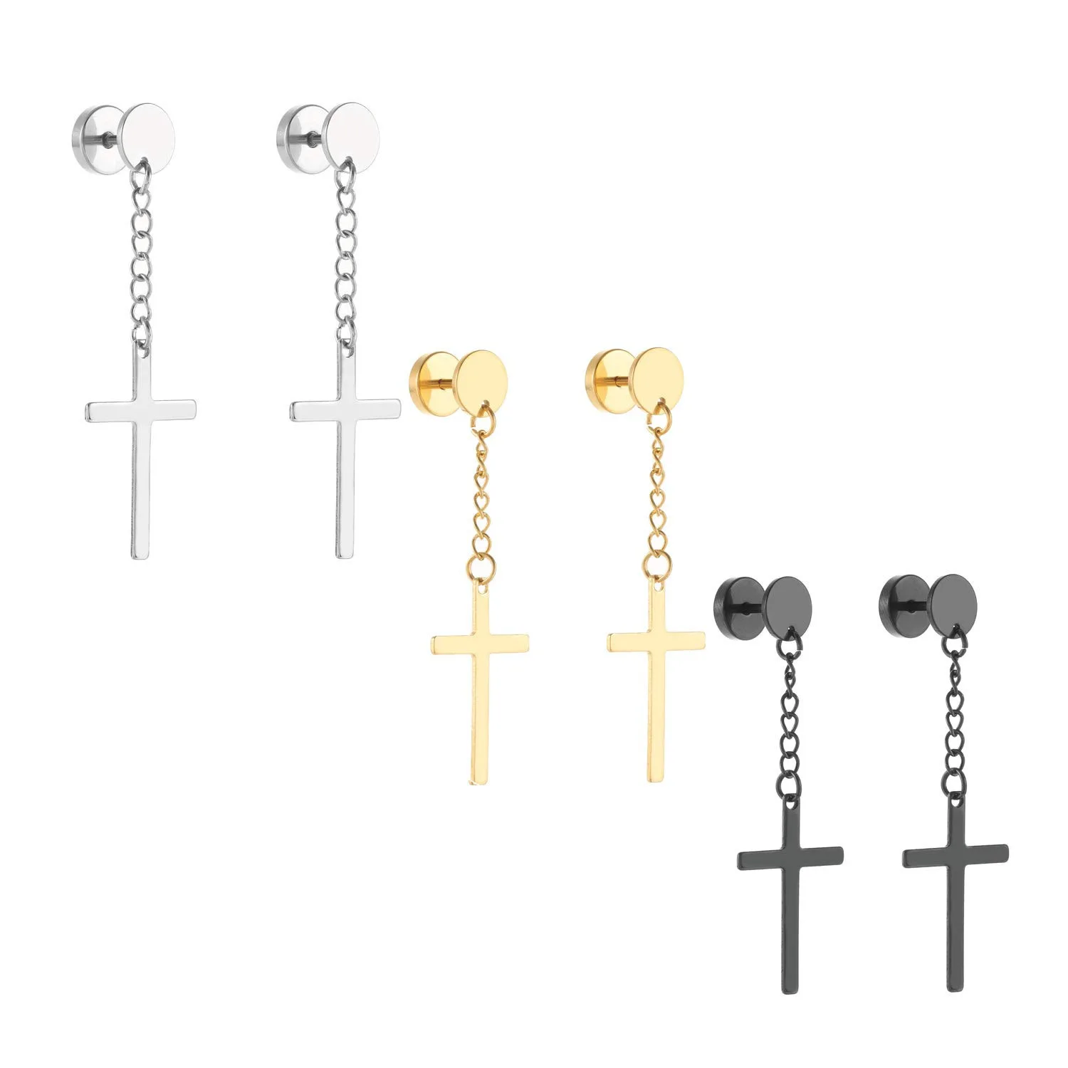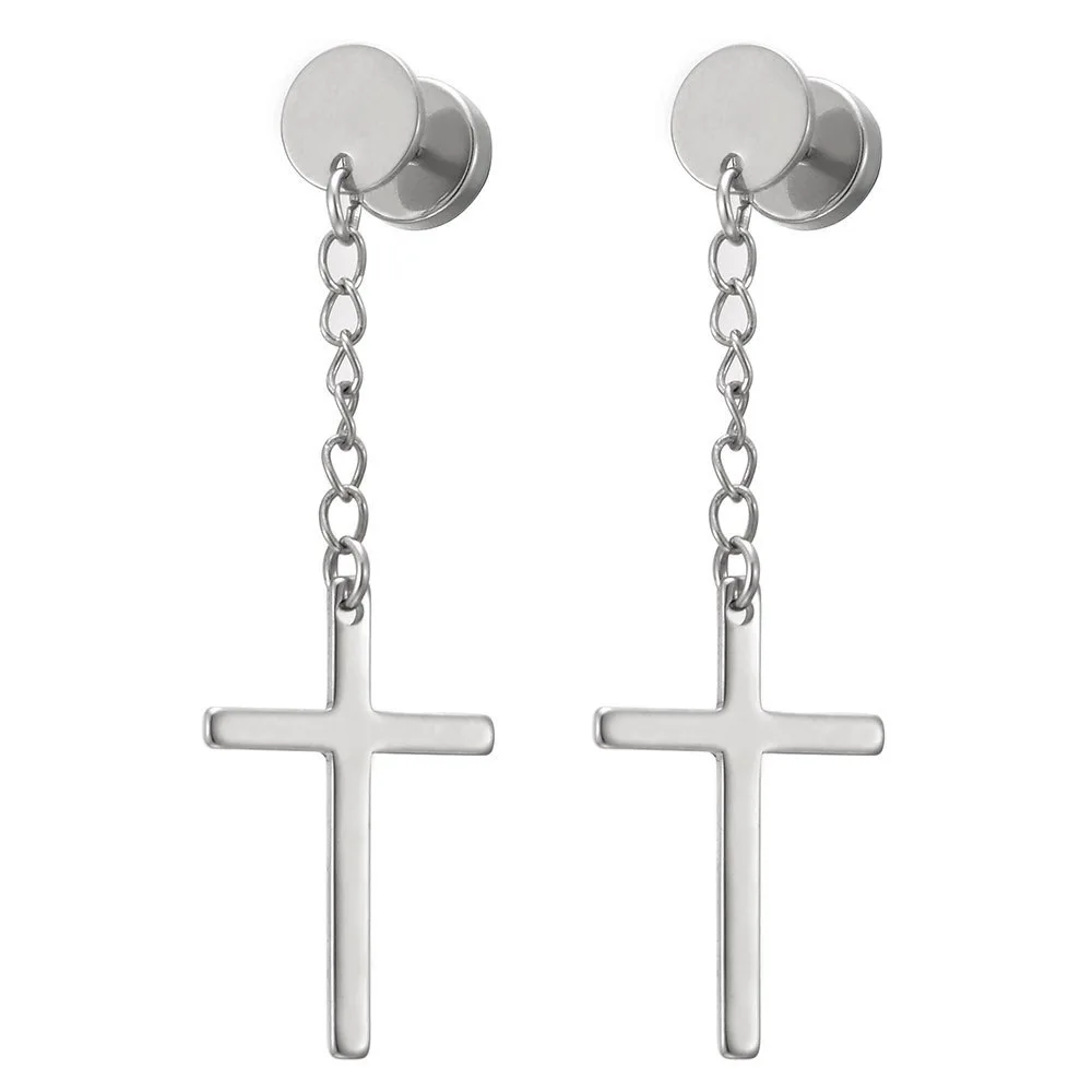 2025 Trending Product Jewelry Men's Magnetic Closure Dumbbell Earrings Gothic Stainless Steel Cross Long Tassel Earrings for Men