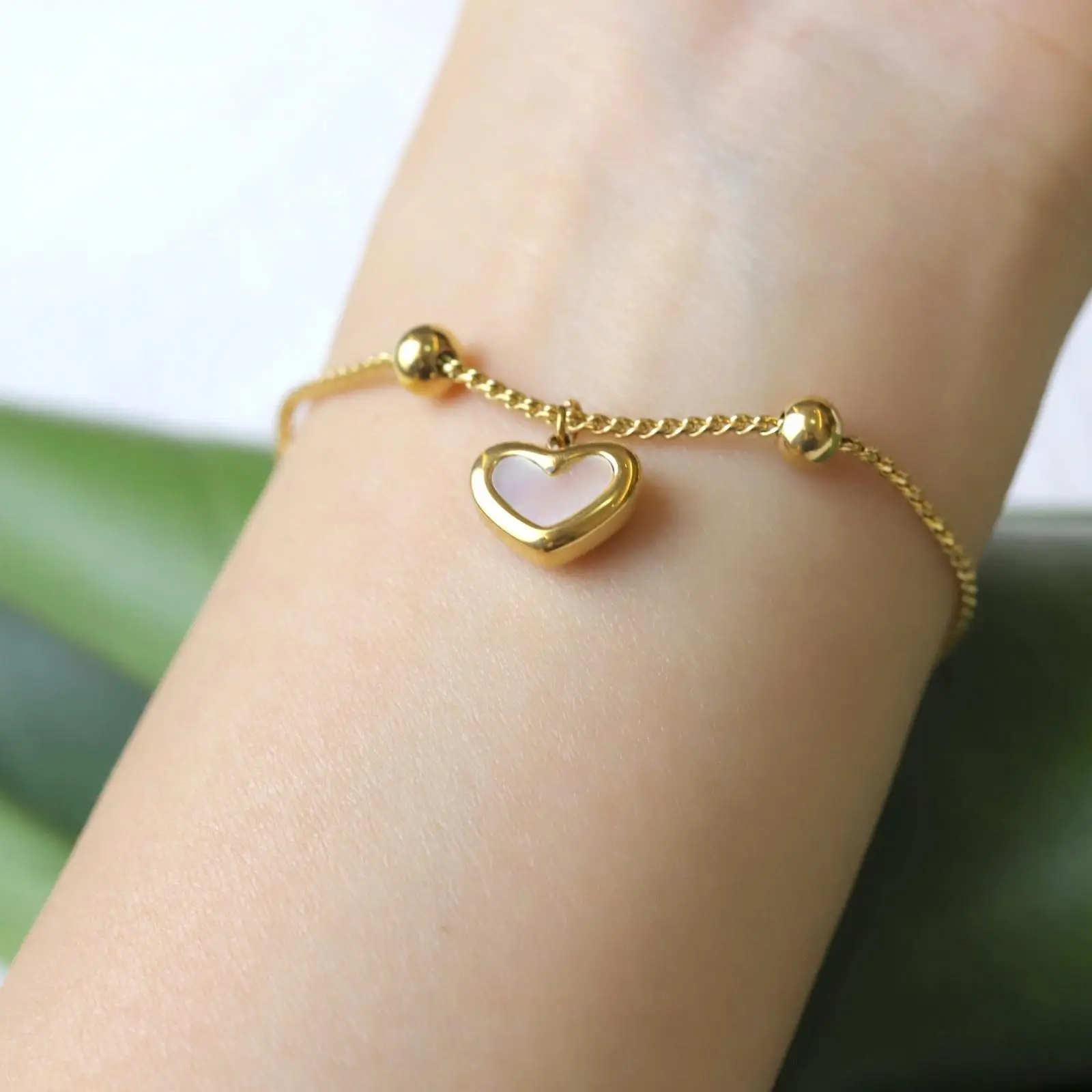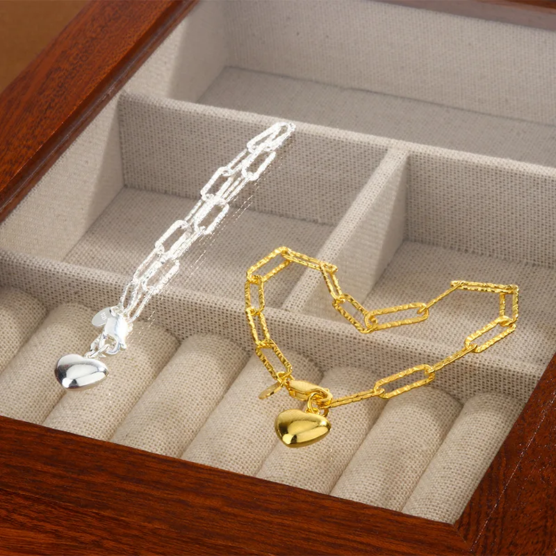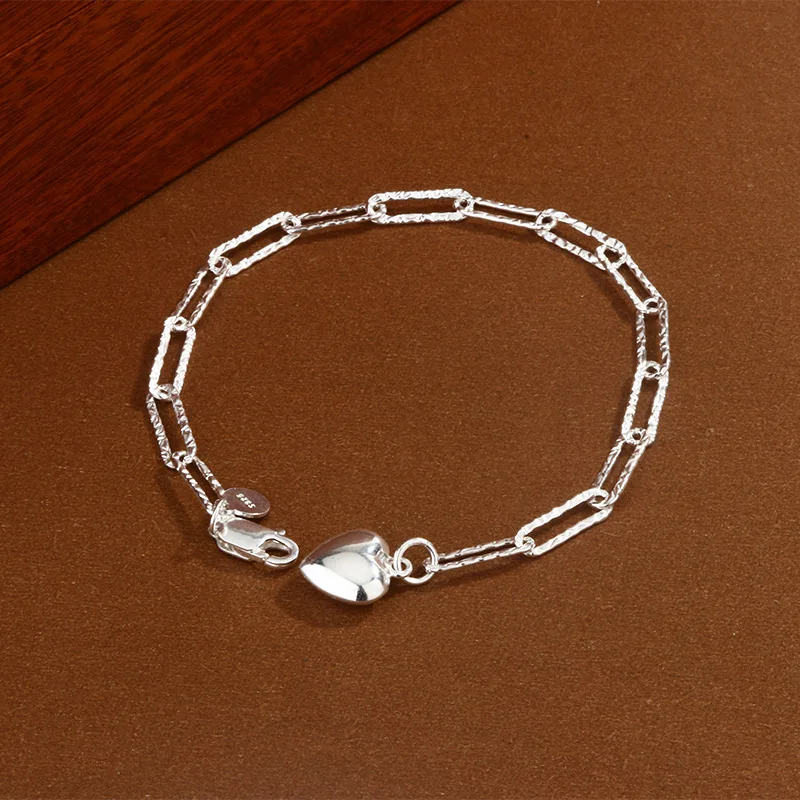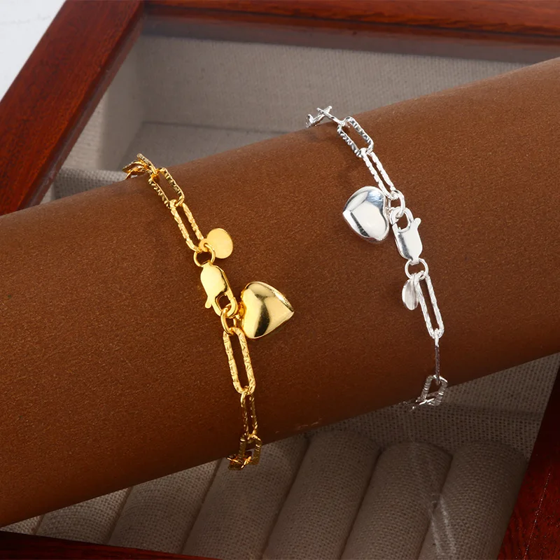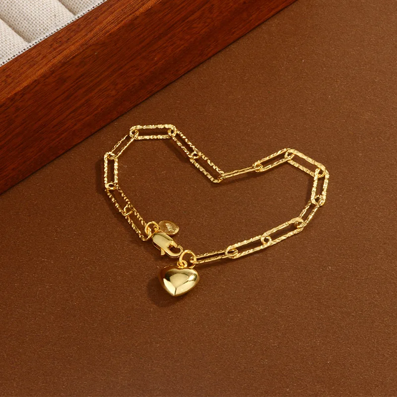 Fashion S925 Sterling Silver Heart Bracelet Gold Plate Textured Paperclip Style Bracelet with a Heart Charm