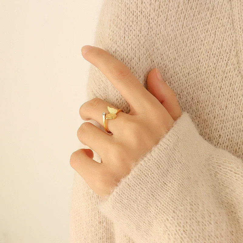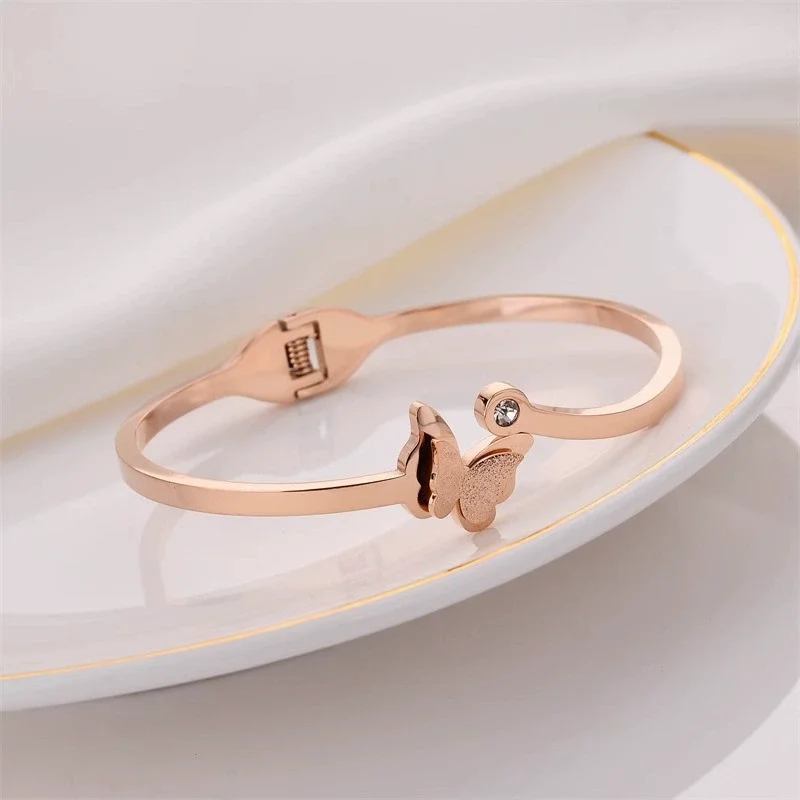 Trendy Rose Gold Plated Titanium Steel Butterfly Pendant Necklace Set With Matching Earrings and Ring