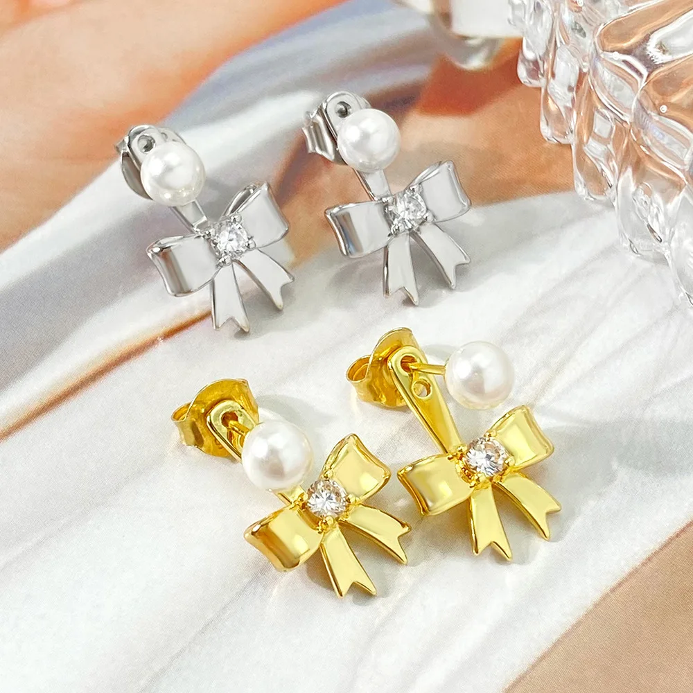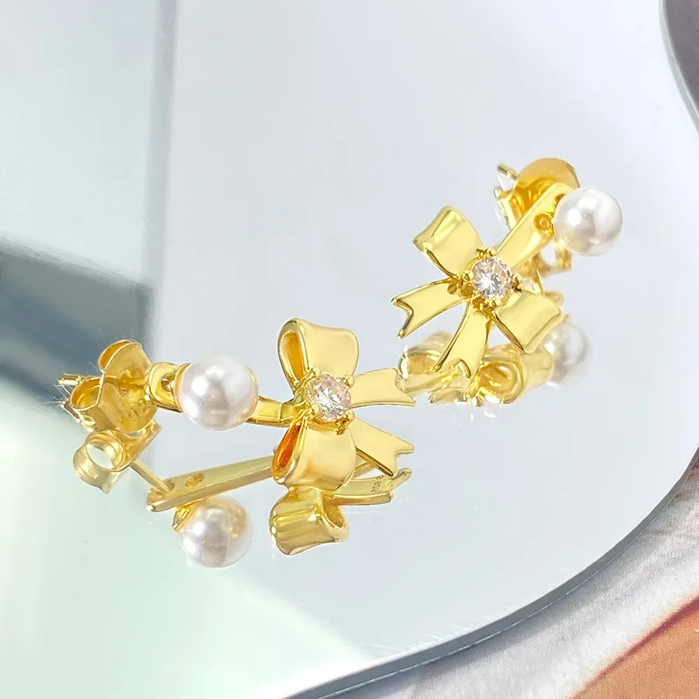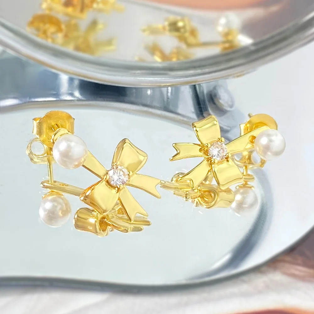 New Fashion Gold Silver Plated Bow Stud Earrings for Women Hypoallergenic Pearl Ribbon Earrings Jewelry