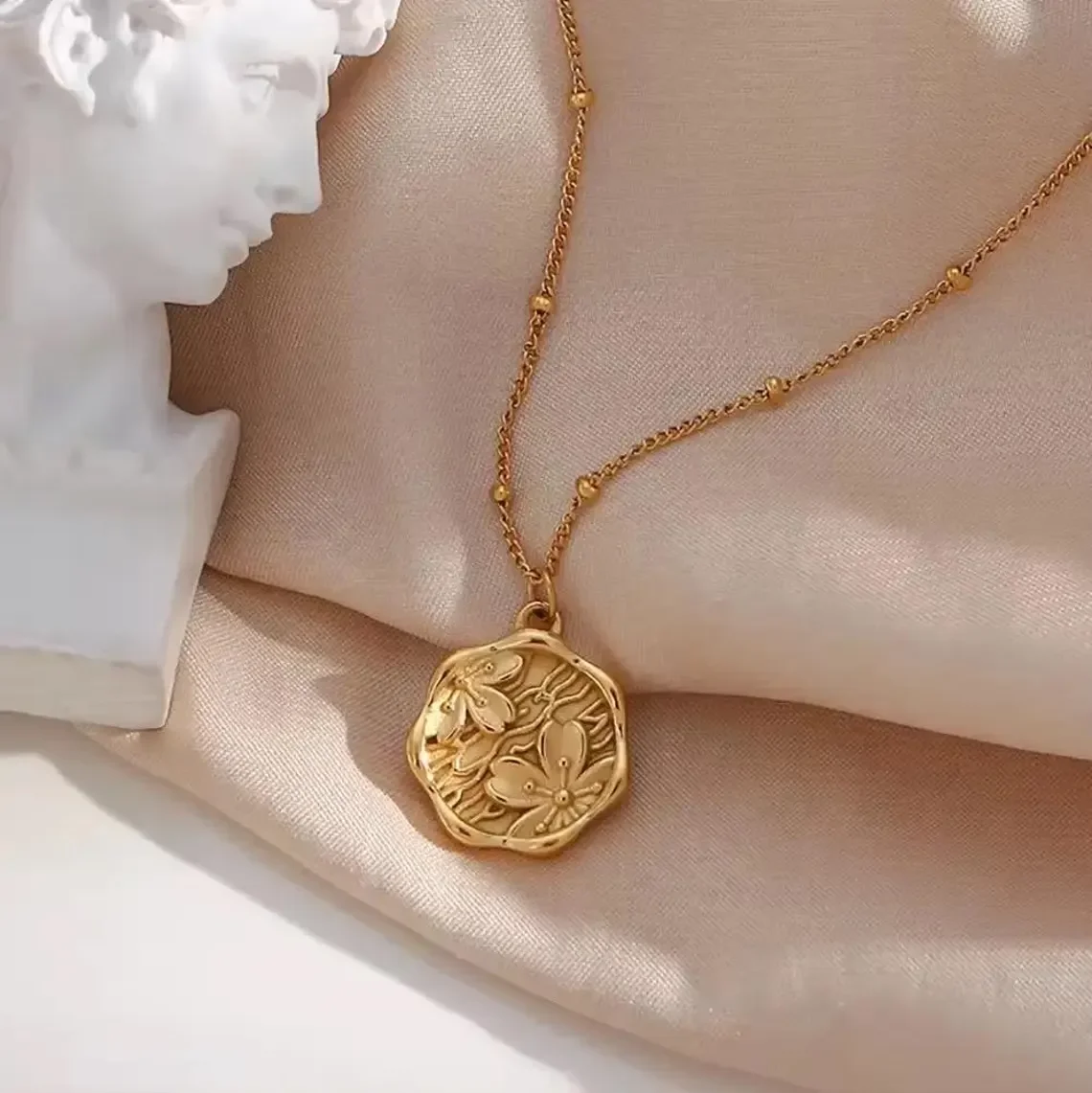 Trendy 18K Gold Plated Cherry Blossom Coin Pendant Necklace for Women Dainty Stainless Steel Sakura Necklace Jewelry Gift