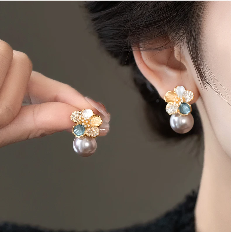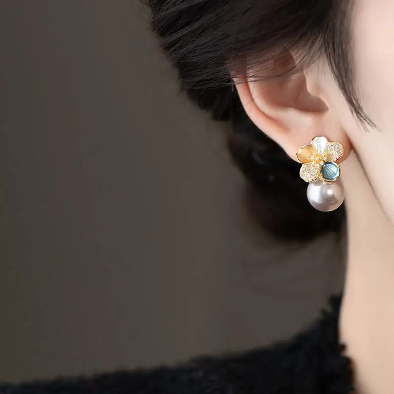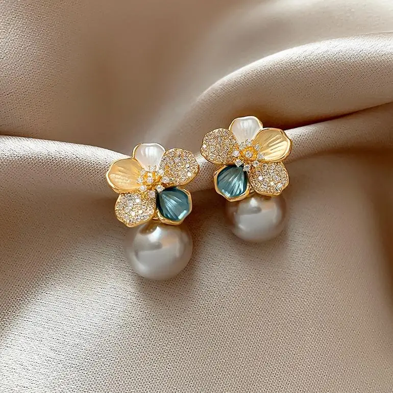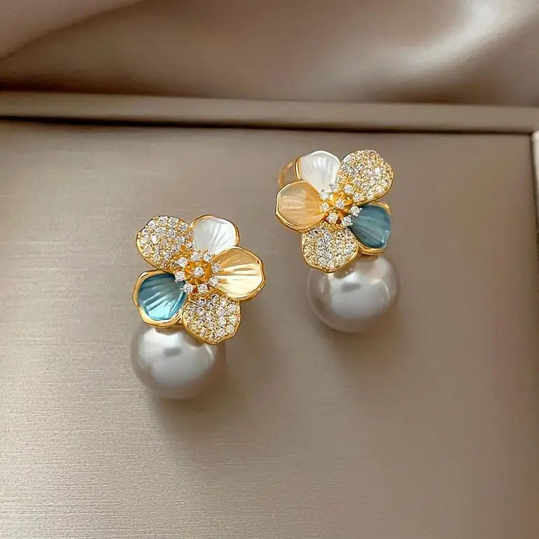 Wholesale Fashion Jewelry Elegant Multicolor Zirconia Flower Pearl Stud Earrings Sparkling Camellia Earrings for Women