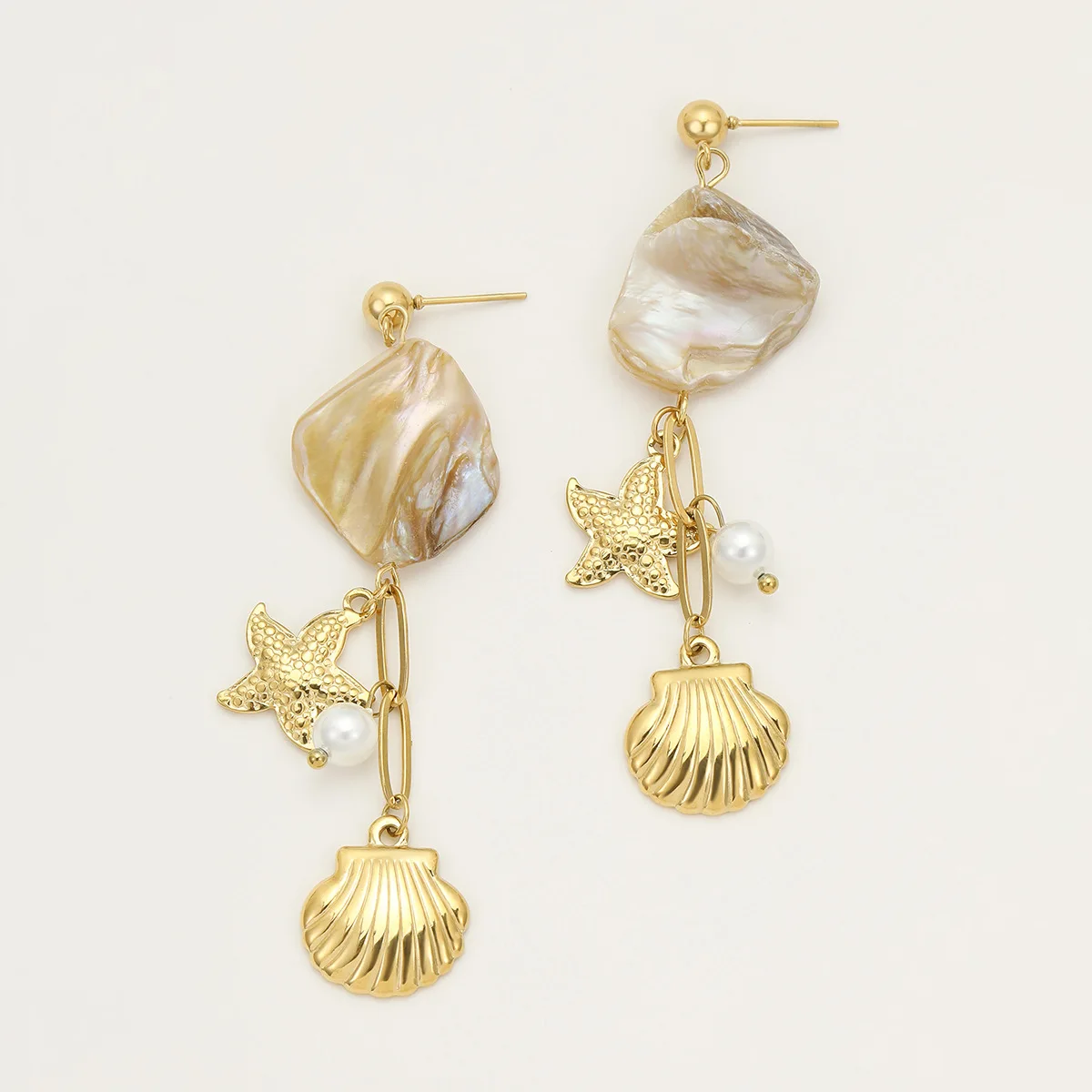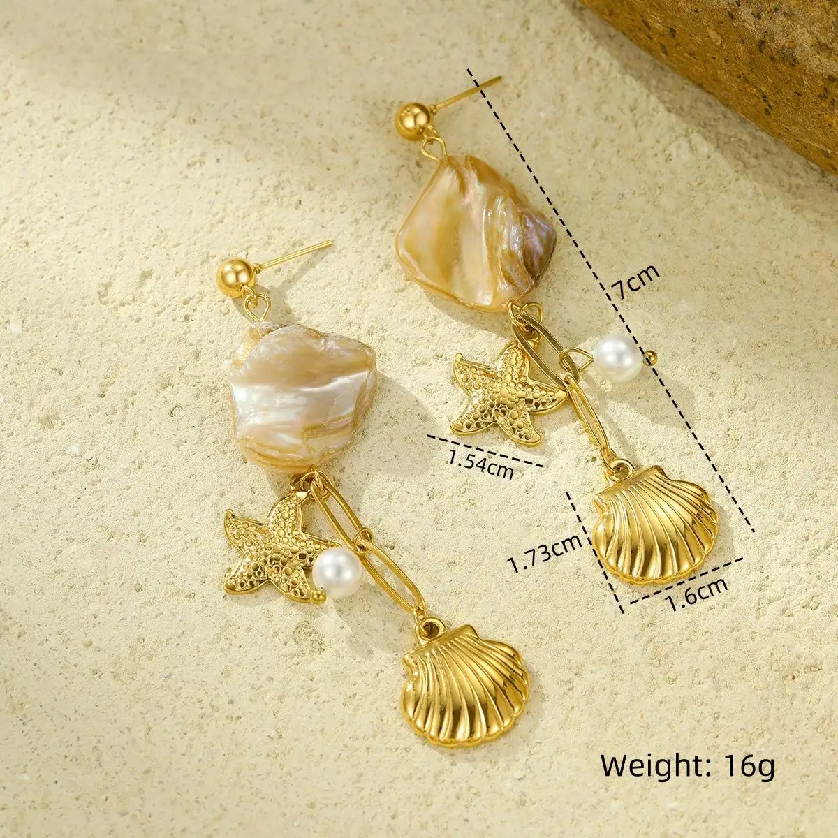 Fashion Women's Ocean Earrings 18k Gold Plated Stainless Steel Shell Starfish Pendant Earrings Stud Fringe Pearl Earrings