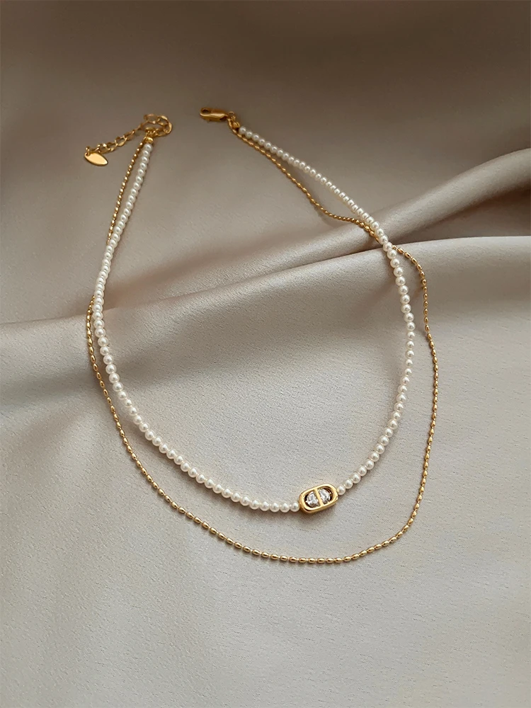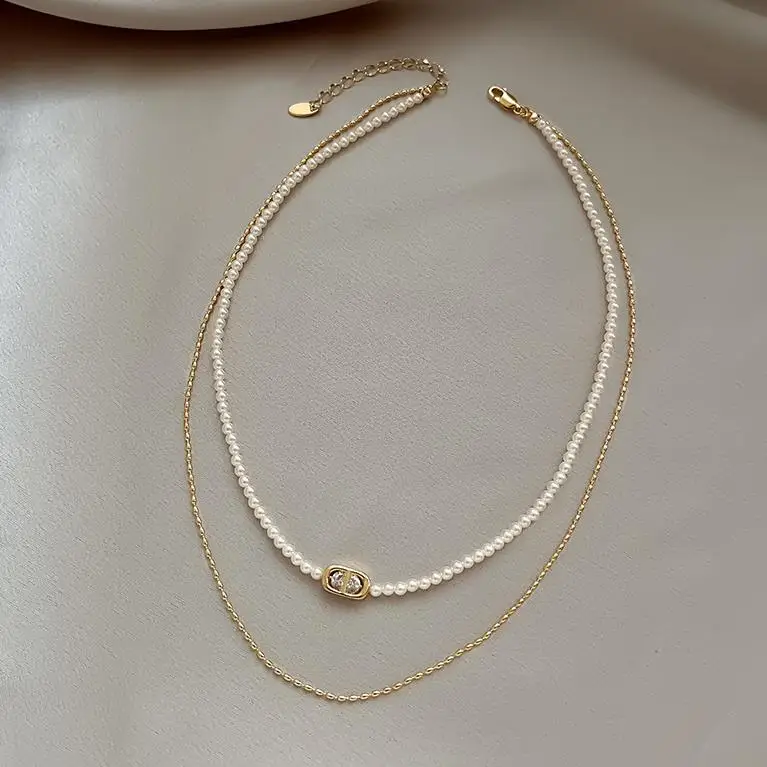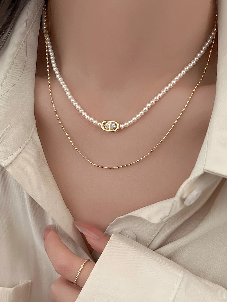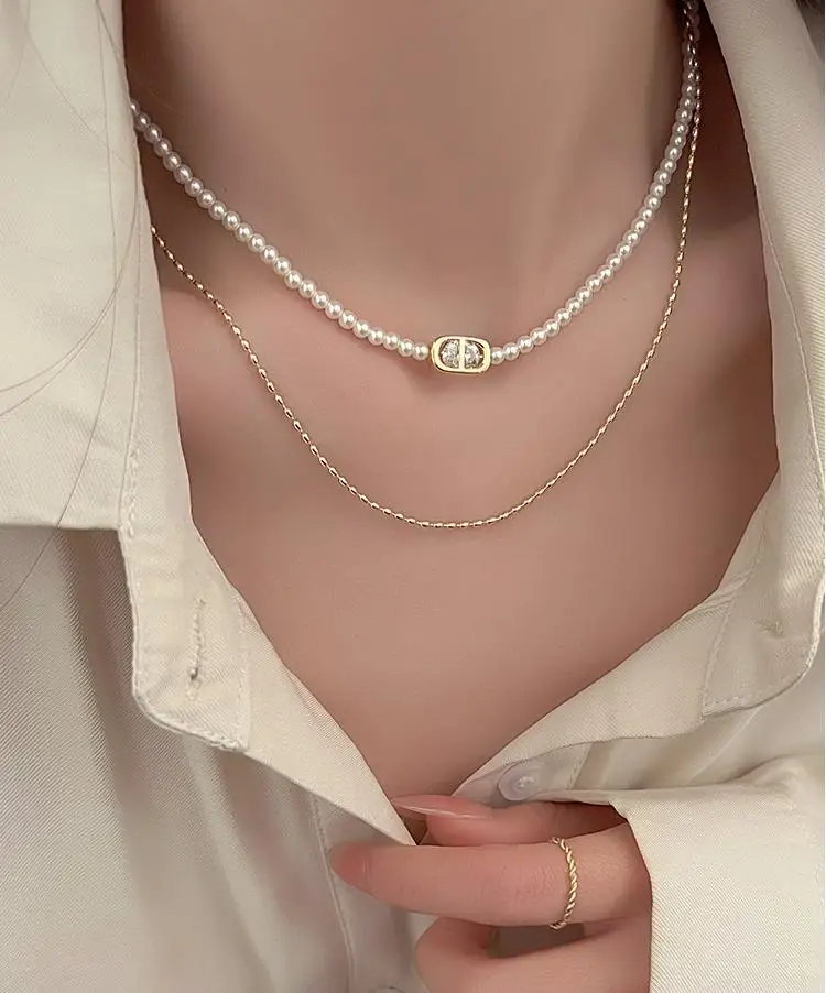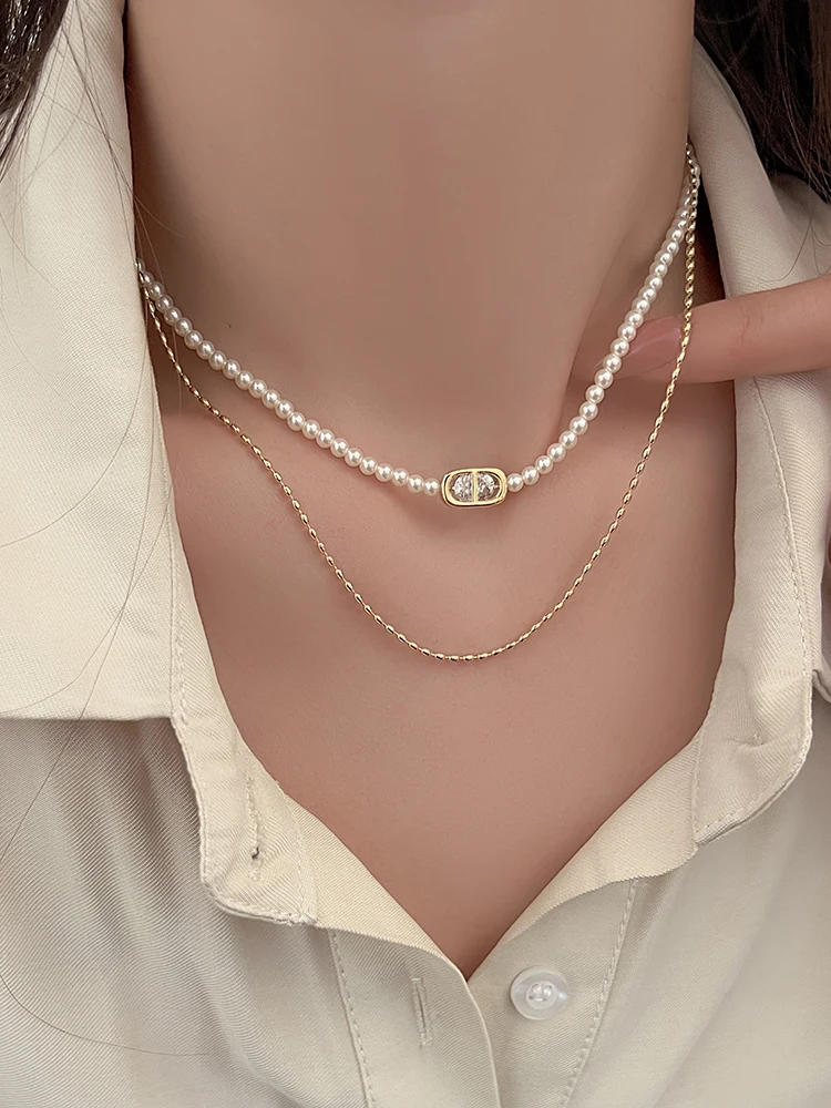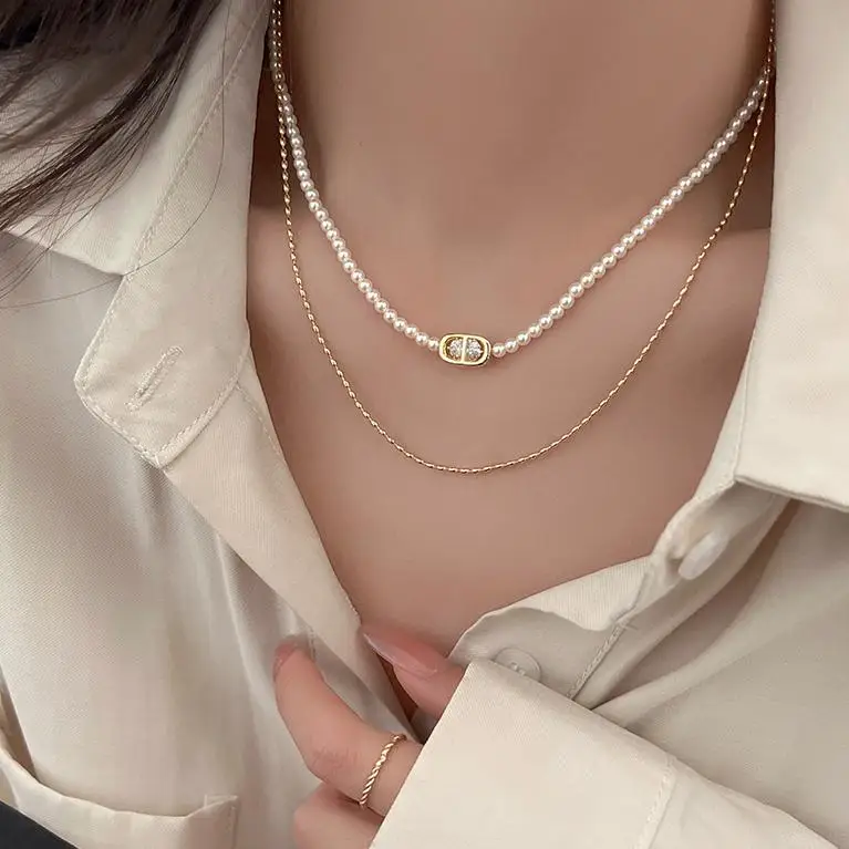 2025 New Arrival Double Layer D Letter Pearl Necklace French Style Layered Chain Jewelry Gift for Women