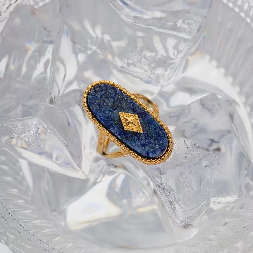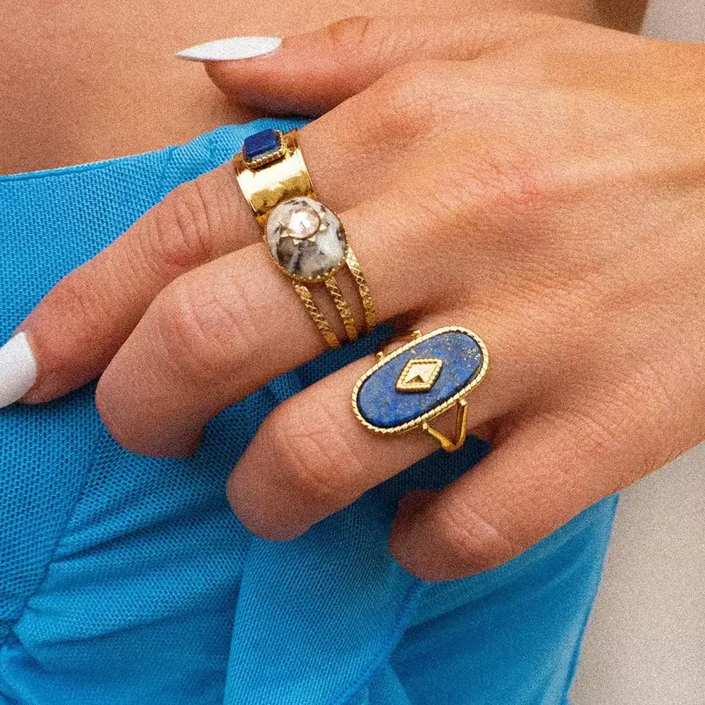 New Design Natural Gemstone Ring Womens Vintage Gold Plated Jewlery Stainless Steel Resizable Rings