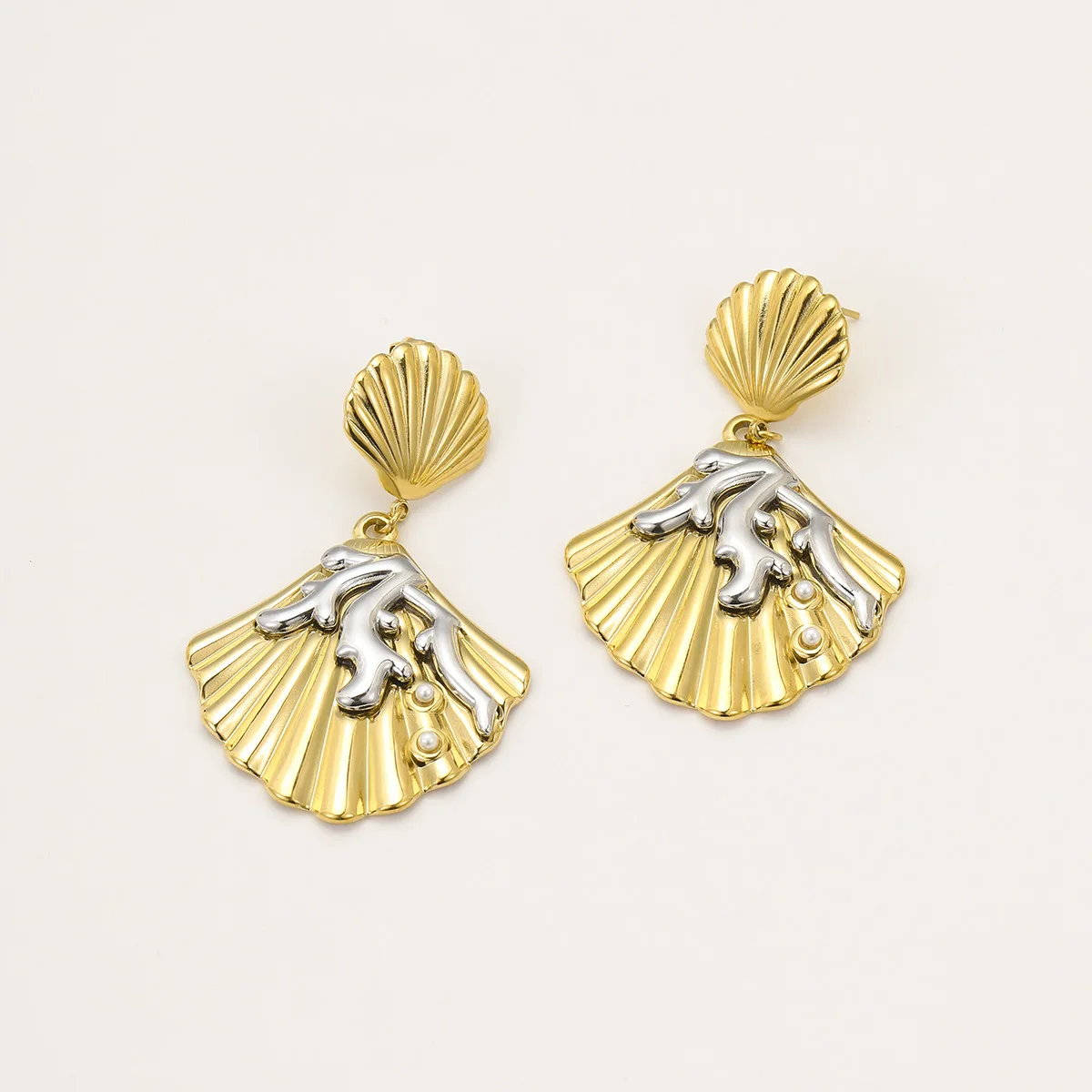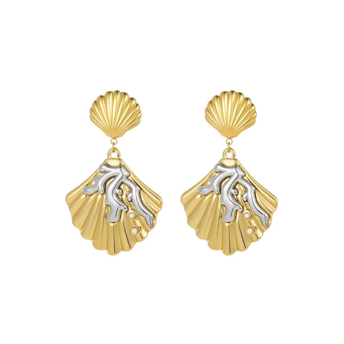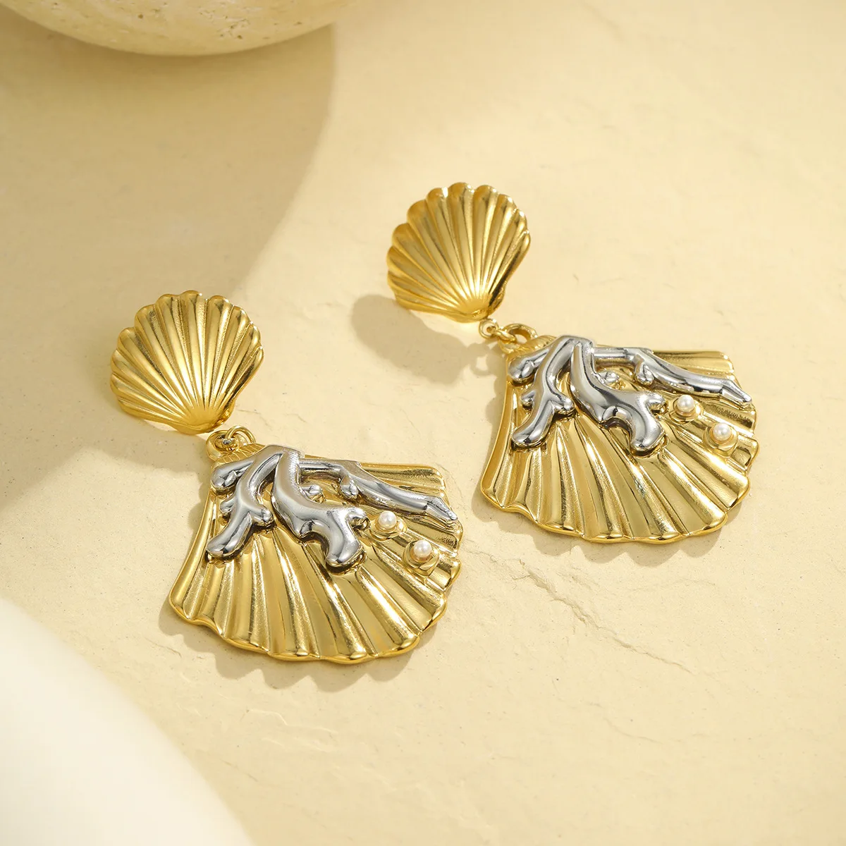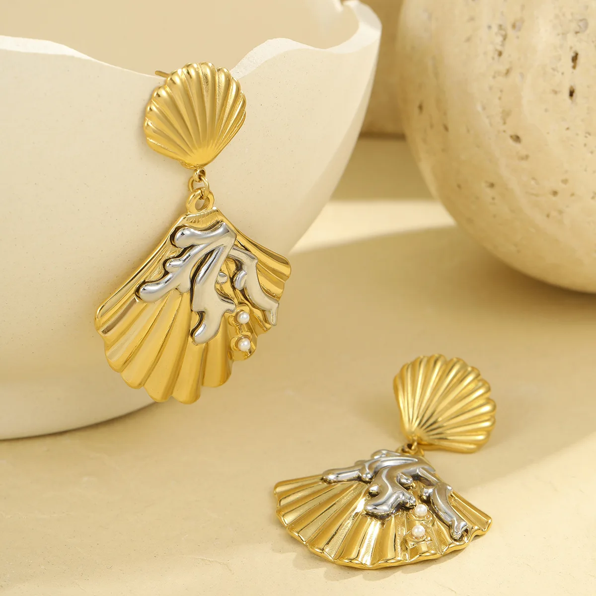 Wholesale Luxury Earrings 18k Gold Plated Stainless Steel Shell Pearl Stud Earrings Women's Dual-Tone Ocean Jewelry