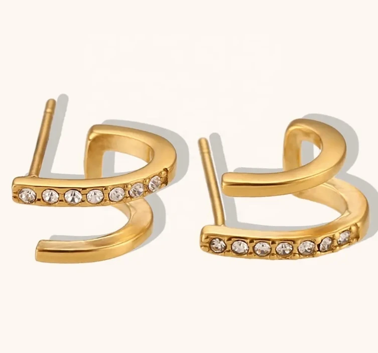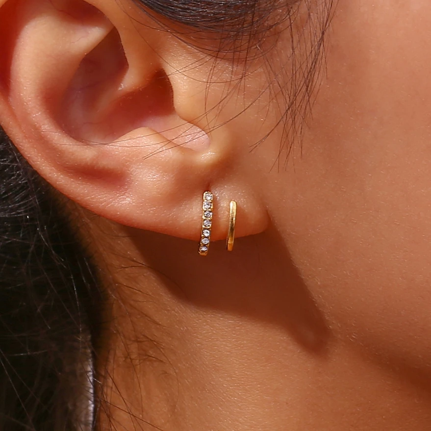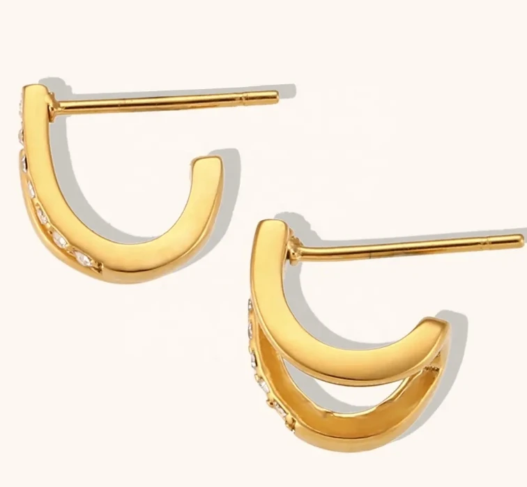 Waterproof Gold Plated Stainless Steel Zircon Double Earring Double Layer Zirconium Semi-circle Round Stud Earrings for Women