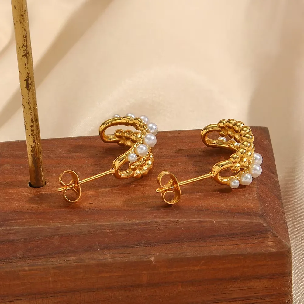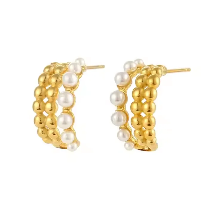 Triple Hoop Gold Bead Pearl Earrings S925 Sterling Silver Cz Hoop Earrings